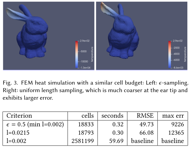 Based on existing meshes, or other surface representations, volumetric meshing creates a partitioning of the interior of the surface, e.g., by tetrahedralizing it. Finite Element Method (FEM) rely on volumetric meshing to run simulations, such as to simulate heat distribution over time (as seen in the example image). The computational runtime and resolution depends directly on the number and size of elements. We are developing an algorithm that creates surface meshes with triangle sizes based on the local feature size. A volumetric meshing based on these sizes could enable both more fine-grained simulation at small features while accelerating the total simulation at no loss of precision by placing large tetrahedra in the interior or at larger features.