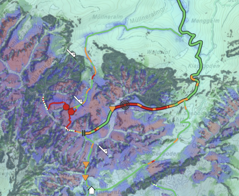 When selecting a route for closer inspection, skitourenguru color-codes segments of the selected route according to the computed avalanche risk and also shows additional icons, such as key danger points or past avalanche events. Currently, this information is shown on a 2D map. This work should visualize the selected route and its associated risk information in 3D. The objectives are performance, readability of route and terrain information on the 3D visualization, as well as usability (intuitive navigation, getting details on demand etc.). Depending on the type of work and the user interest, the strengths and limitations of 3D vs. 2D route representations should also be compared in a small user study.